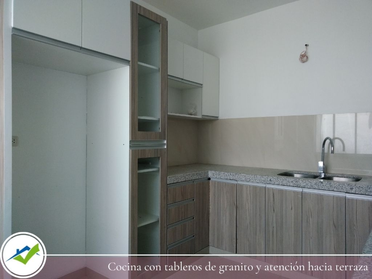La cocina cuenta con tablero de granito y atención hacia la terraza, incluye una cocina encimera y campana extractora.