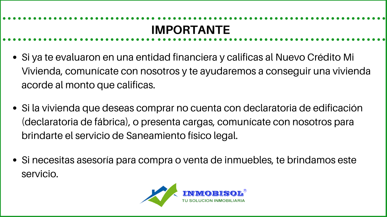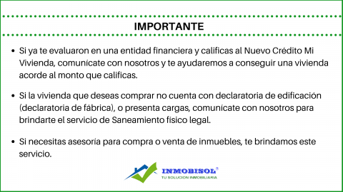 * Si la vivienda que deseas comprar no cuenta con declaratoria de edificación (declaratoria de fábrica), o presenta cargas, comunícate con nosotros para brindarles el servicio de Saneamiento físico legal.